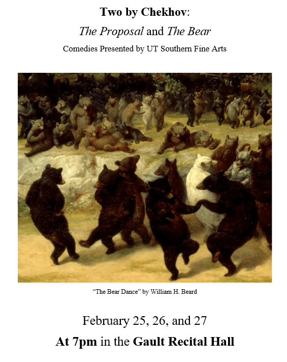 As spring 2023 winds to a close, my mind is already turning to the fall and what plays I am going to do. This year has definitely been a learning experience as I have taken over directing play performances at UT Southern and did not have a clear idea of what talent was available at the school as well as other resources (human and otherwise). It has definitely been a growing experience for both plays that I have directed this year including a Shakespearean mashup, Shakespeare’s Tragic Women, and Two by Chekhov: The Proposal and The Bear. Both plays have given me insight into several student prospects for the plays but additionally ideas of how to reach students and get them involved. We were supposed to do one more reader’s theatre piece Boycott; however, we have had to postpone due to extenuating circumstances.